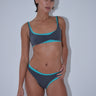 A double layered jersey thong made from the softest, sustainable bamboo jersey. This piece has been designed to conceal and reveal its under-layer, a bright pop of turquoise. The two layers are sewn together to be worn as one.
