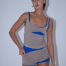 A double layered jersey vest made from the softest, sustainable bamboo jersey. This piece has been designed to conceal and reveal its under-layer, a bright pop of cobalt blue. The two layers are sewn together to be worn as one.